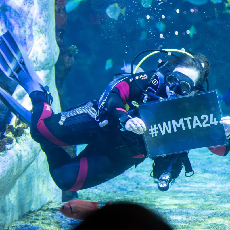 The evening started with a drinks reception where guests could network with fellow finalists, take a picture in front of the branded step and repeat and take in the fascinating surroundings, including a diver in an aquarium full of sharks with the #WMTA24 hashtag.